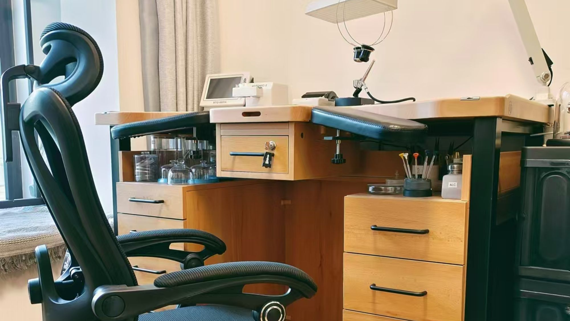 私人工坊的設備工具約有 60% 進口自瑞士、歐洲、北美、新加坡、馬來西亞等地,為本人執業期間因各種機緣巧合取得的優質物件,大多數爲品牌原廠工坊汰換下來的設施。除此之外,約有 40% 為中國製造的輕工具。